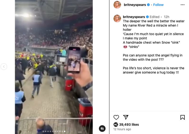 Britney Spears has bizarrely shared footage on social media of West Ham fans fighting in their Europa Conference League game against AZ Alkmaar last season.