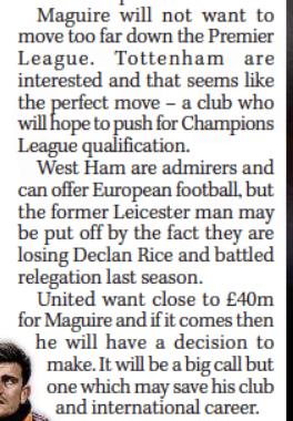 The report suggests that, although the Hammers could offer Maguire European football, he is likely to prefer a move to Tottenham as West Ham look set to lose star man Rice this summer.