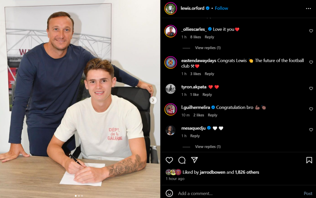 Teenage starlet Orford posted on his Instagram page [4 September] to express his delight at the news, posing with his paperwork alongside sporting director and Hammers legend Mark Noble.