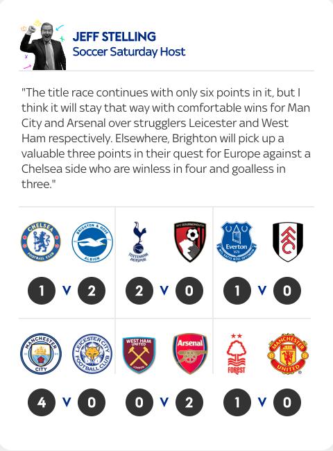 “The title race continues with only six points in it, but I think it will stay that way with comfortable wins for Man City and Arsenal over strugglers Leicester and West Ham respectively,” he said.