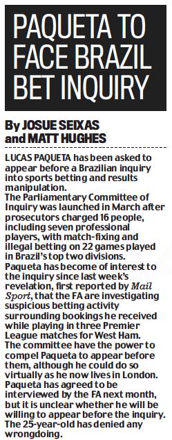 The newspaper reported in their print edition (25 August, back page) that the Brazilian Parliamentary Committee of Inquiry, since being established in March, has charged seven professional footballers in Brazil’s top two divisions for match-fixing and illegal betting, with Paqueta the latest to be questioned.