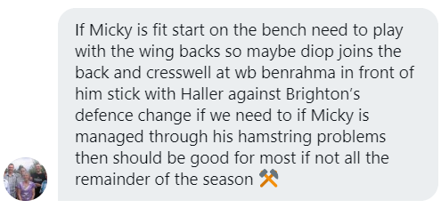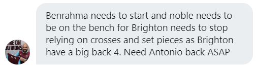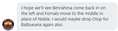 But if we had to predict what changes Moyes will make for the Brighton game, we think Benrahma will replace Noble and Fabian Balbuena might come in for Issa Diop at the back.
