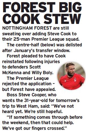 Nottingham Forest are waiting for a decision from the Premier League on re-adding Steve Cook to their squad ahead of their game against West Ham on Saturday (25 February), according to a report from The Mirror (page 63, 24 February).