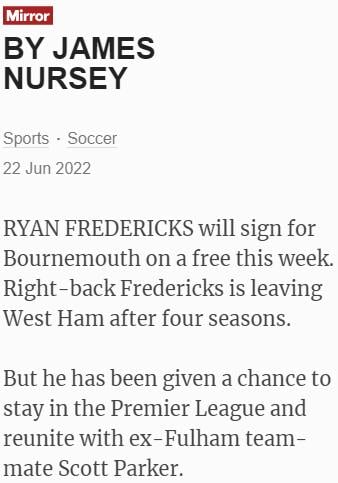 Ryan Fredericks will reportedly seal his West Ham exit and join newly-promoted Premier League side Bournemouth this week.