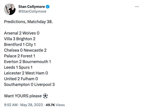 Stan Collymore has made his predictions for the final day of the Premier League season, including the clash between West Ham and Leicester.