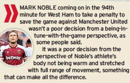 “Mark Noble coming on in the 94th minute for West Ham to take a penalty to save the game against Manchester United wasn’t a poor decision from a being-in-tune-with-the-game perspective, as some people said,” said Collymore in the print edition of the Mirror [September 21, page 61].