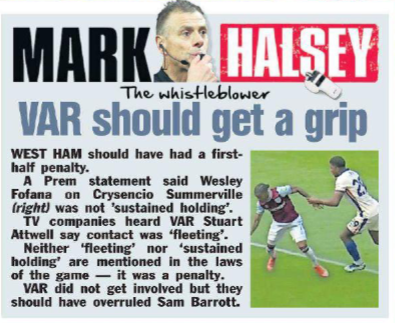 VAR Stuart Attwell was then overheard claiming the contact was “fleeting”, to which Halsey has angrily responded on page three of the Sun on Sunday’s sport pullout [22 September].