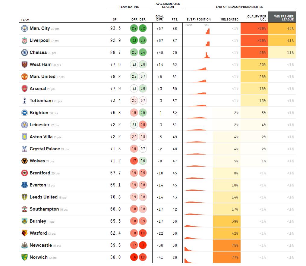 They currently sit in the top four and FiveThirtyEight’s Super Computer predicts them to remain there until the end of the season with 62 points to their name.