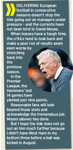“Reasonable fans will look beyond those stats and acknowledge the tremendous job Moyes has done. But I hope the tide does not go out on him too much further because I didn’t have West Ham in my bottom three before a ball was kicked in August.”