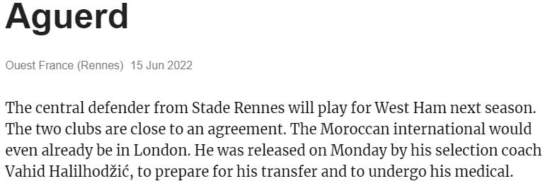 West Ham and Rennes are believed to be very close to reaching an agreement and Aguerd has even been given permission by the Moroccan federation to secure a transfer.