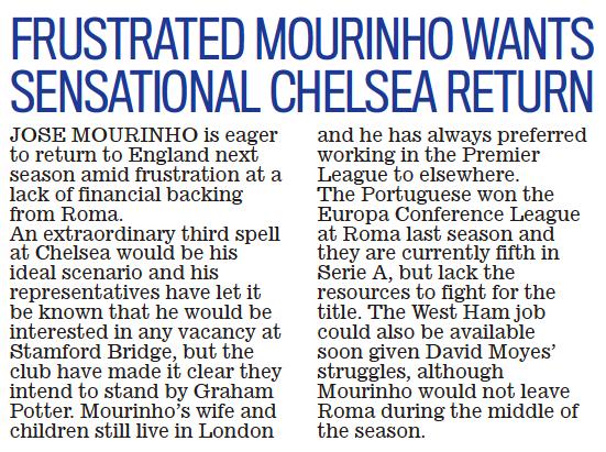 “Jose Mourinho is eager to return to England next season amid frustration at a lack of financial backing from Roma. An extraordinary third spell at Chelsea would be his ideal scenario and his representatives have let it be known that he would be interested in any vacancy at Stamford Bridge,” as quoted by the Daily Mail, pg.114. (28 January)