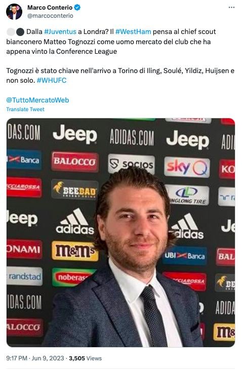 “From Juventus to London? West Ham thinks of the Juventus chief scout Matteo Tognozzi as the market man of the club that has just won the Conference League,” he wrote on his personal Twitter account (9 June).