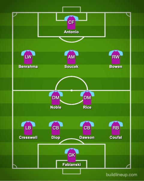 Predicted West Ham XI v Burnley: Fabianski; Coufal, Dawson, Diop, Cresswell; Rice, Noble, Soucek; Bowen, Antonio, Benrahma