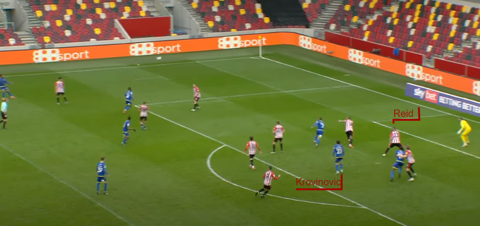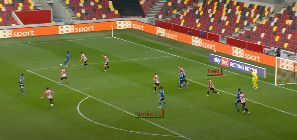 Below you can see Reid and Krovinovic in the penalty area. Reid doesn’t need to be man-marking the Croatian midfielder but he does have a good eye on him in case anything happens.