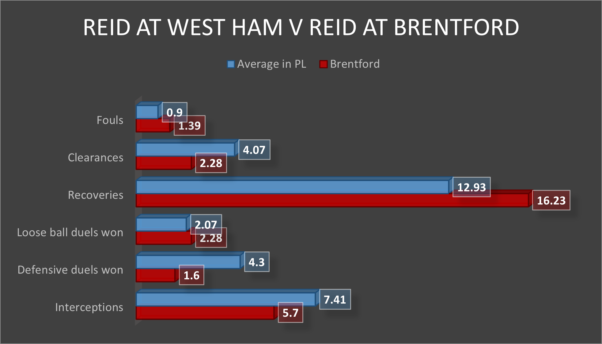 Below is a chart that shows how Reid’s stats at Brentford stack up to his Premier League stats over the years at West Ham.