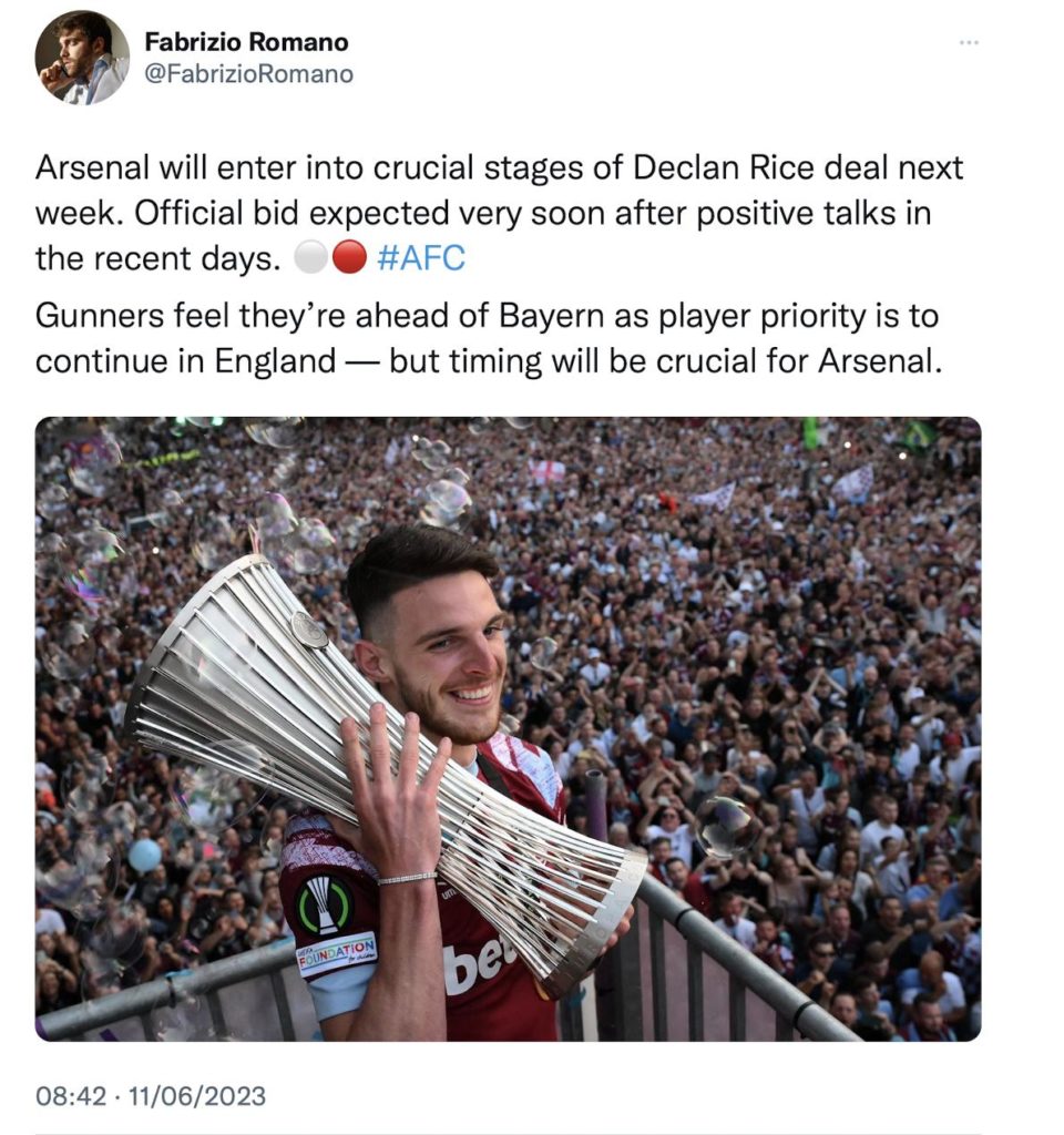 “Arsenal will enter into crucial stages of Declan Rice deal next week,” he wrote.