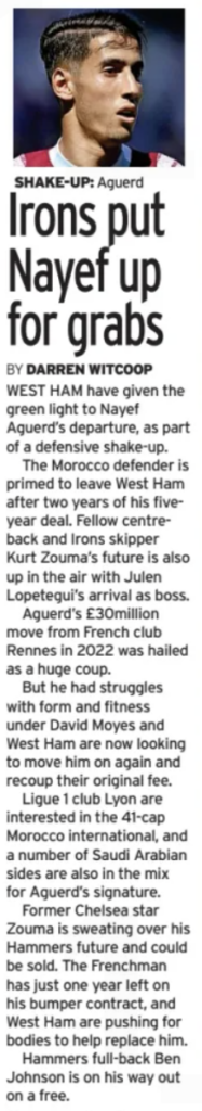The journalist reported for the Sunday People (9 June, page 56) that the Hammers captain’s future is up in the air under the Spaniard.