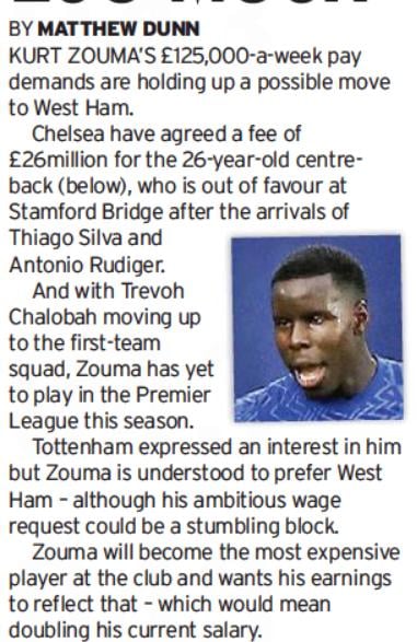 The newspaper reports via their print edition on August 24 [page 48] that while Zouma, 26, is open to joining the Hammers, he could price himself out a move to the London Stadium.