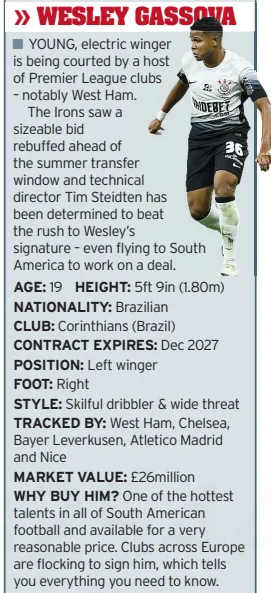 Tim Steidten remains intent on signing Corinthians forward Wesley Gassova after the West Ham chief jetted out to Brazil earlier this summer, according to the Sunday Mirror.