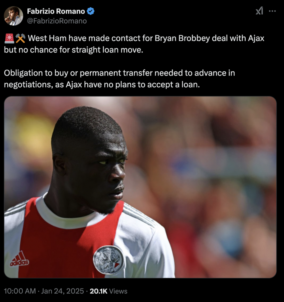 Romano shared: “West Ham have made contact for [Brian] Brobbey deal with Ajax but no chance for straight loan move.