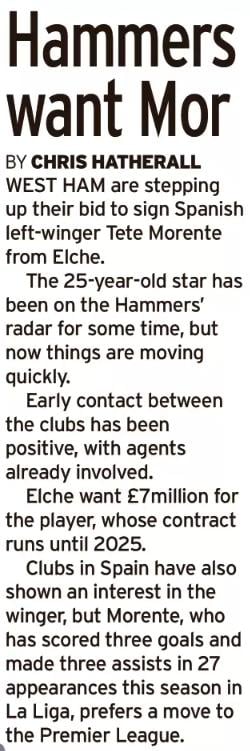 The newspaper reports via their print edition [1 May, page 74] that Morente, 25, is a long-term target at the London Stadium with Elche demanding £7million for the versatile attacker.