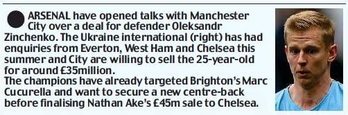 The newspaper reported via their print edition on Friday (15 July, page 75) that Arsenal are in talks to sign the 25-year-old Ukraine international, who’s valued at around £35million by Premier League champions Man City.