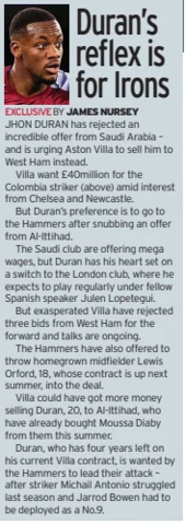 The paper reported via its print edition (28 July, page 71) that the Colombian is very keen on a move to the London Stadium, even rejecting an “incredible” and lucrative offer from Saudi Arabia.