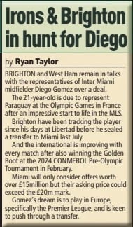 West Ham United have opened talks to sign Inter Miami midfielder Diego Gomez this summer, according to the Sunday People.