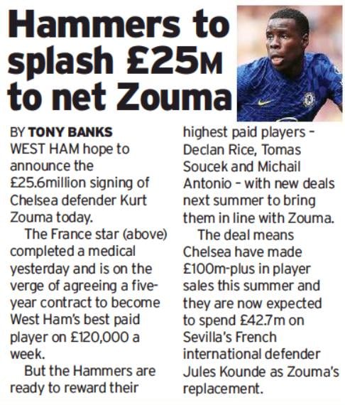 The Mirror adds that Declan Rice, Tomas Soucek and Michail Antonio will get new deals next summer to bring their wages to the level that Zouma is at.